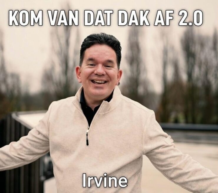 Irvine lanceert met “Kom van dat dak af 2.0” een feestelijke en eigentijdse remake van de klassieker van Peter Koelewijn. Samen met producer Marco Leeuwis (DJ Galaga) gaf hij het nummer een frisse, moderne sound, terwijl de herkenbare melodie behouden bleef. Het resultaat: een energieke feestplaat die garant staat voor beweging op de dansvloer! Ook in ons VBRO-Feestcafé!