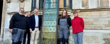 Plaatsing van gerestaureerde glaspanelen aan balkon Brugse Stadhuis
